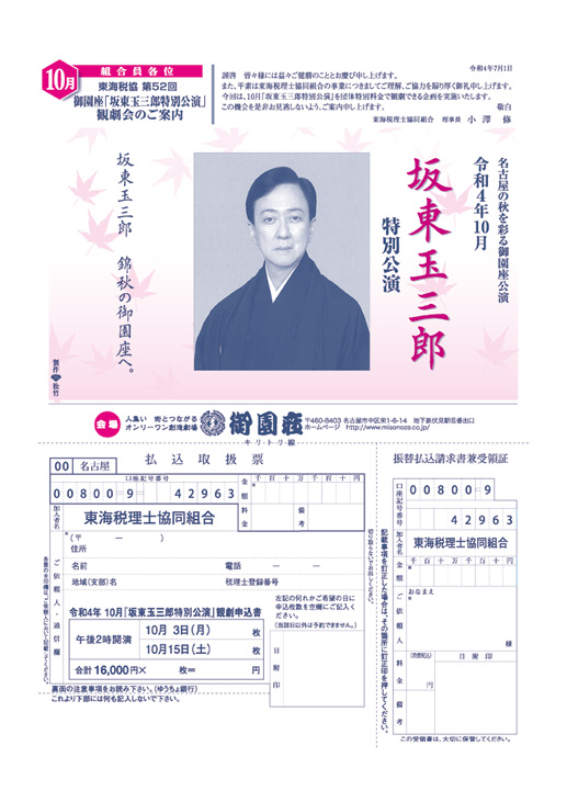 組合員等の福利厚生事業として、10月の御園座「坂東玉三郎特別公演」を団体特別料金で観劇していただけます。