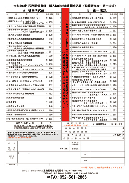 当組合では教育事業の一環として、上限7,000円まで書籍の購入助成を行っています(本年度は、税務研究会もしくは第一法規)。